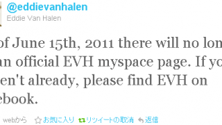 エディの MySpace の公式アカウントが閉鎖されることが予告されました。閉鎖予定日は6月15日だそうです。Twitter / @Eddie Van Halen: As of June 15th, 2011 ther ...