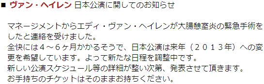 『ファンの皆様へ。エディ・ヴァン・ヘイレンです。今回は私の健康状態の事で、日本ツアーを延期せざるを得なかったことをとても残念に思っています。本当に楽しみにしていました。この状況に心からお詫び致しますが、来年必ず日本に戻って今までで最高のコンサートを行う事をファンの皆様に約束します。デイヴ、アレックス、ウルフギャング、そして私も皆様にお会いできるのを凄く楽しみにしています。』